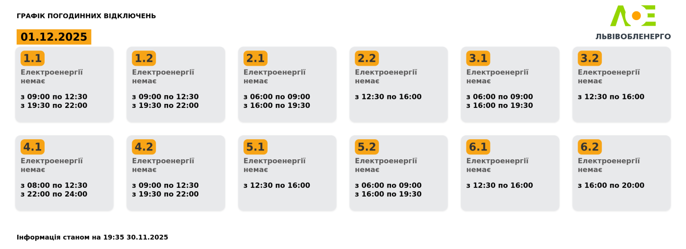 Група 1.1. Електроенергії немає з 09:00 до 12:30, з 19:30 до 22:00.