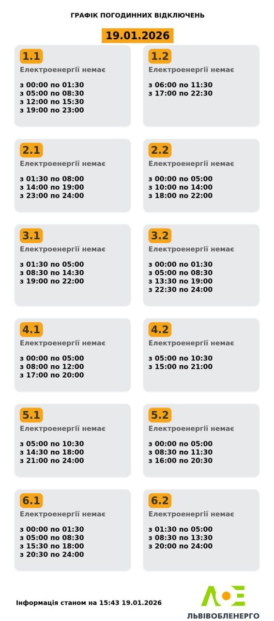 «Львівобленерго» оновило графіки відключень світла на понеділок, 19 січня.