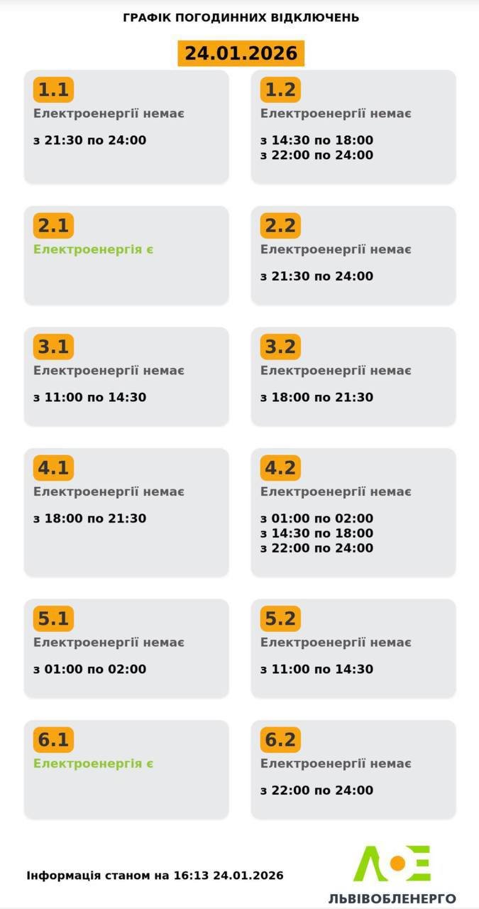 Львівобленерго опублікувало оновлені графіки відключень світла станом на 16:00 год 24 січня.
