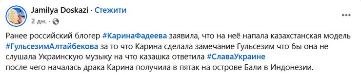 Російська блогерка Карина Фадєєва нібито постраждала внаслідок нападу казахстанської моделі Гульсезім Алтайбекової в одному з ресторанів на острові Балі в Індонезії. Росіянка зробила зауваження за прослуховування української музики, після чого між дівчатами почалася бійка.